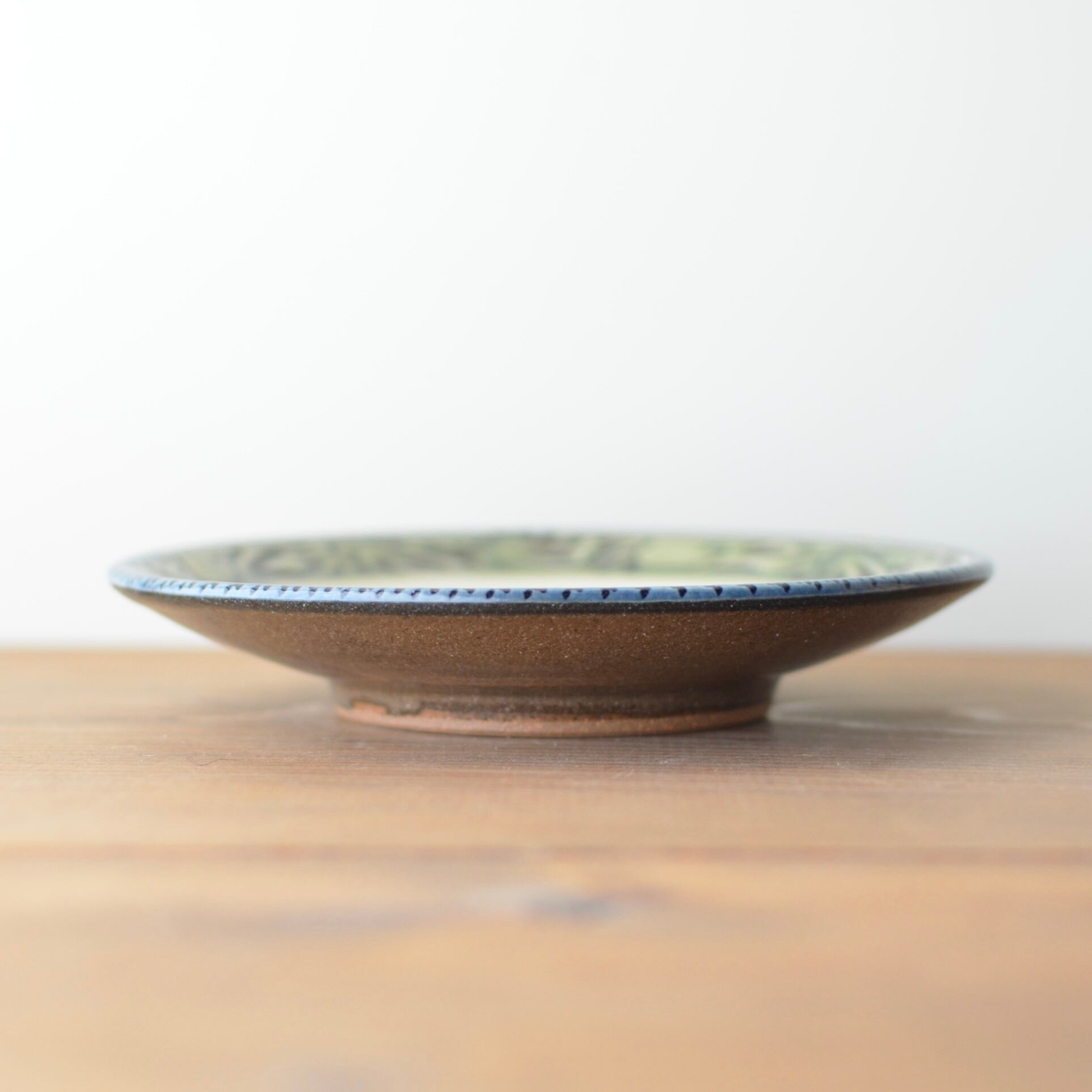 この緑釉唐草文の爽やかなグリーンとブルーの色合いは、